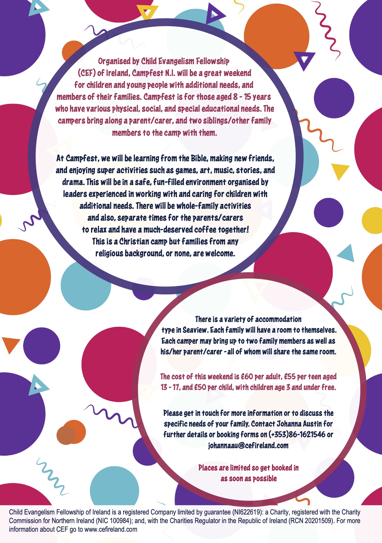 Being a one-to-one with a child with additional needs and supporting the family so that they can participate and enjoy the camp experience. We will have an outing on Saturday afternoon so you may need a small amount of money for that if you want to buy a coffee.